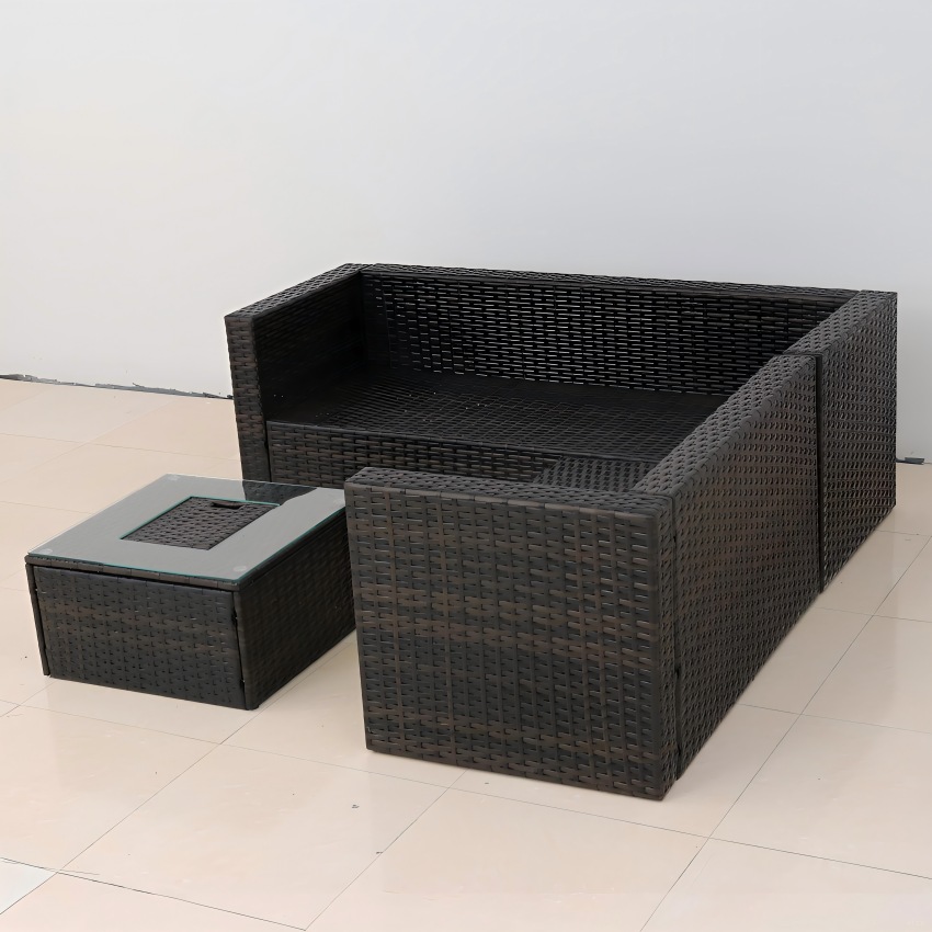 Outdoor wicker(rattan) corner sofa set with cushion, comprising 3-seater, loveseat, coffee table & ottoman, offering a multitude of layout possibilities.