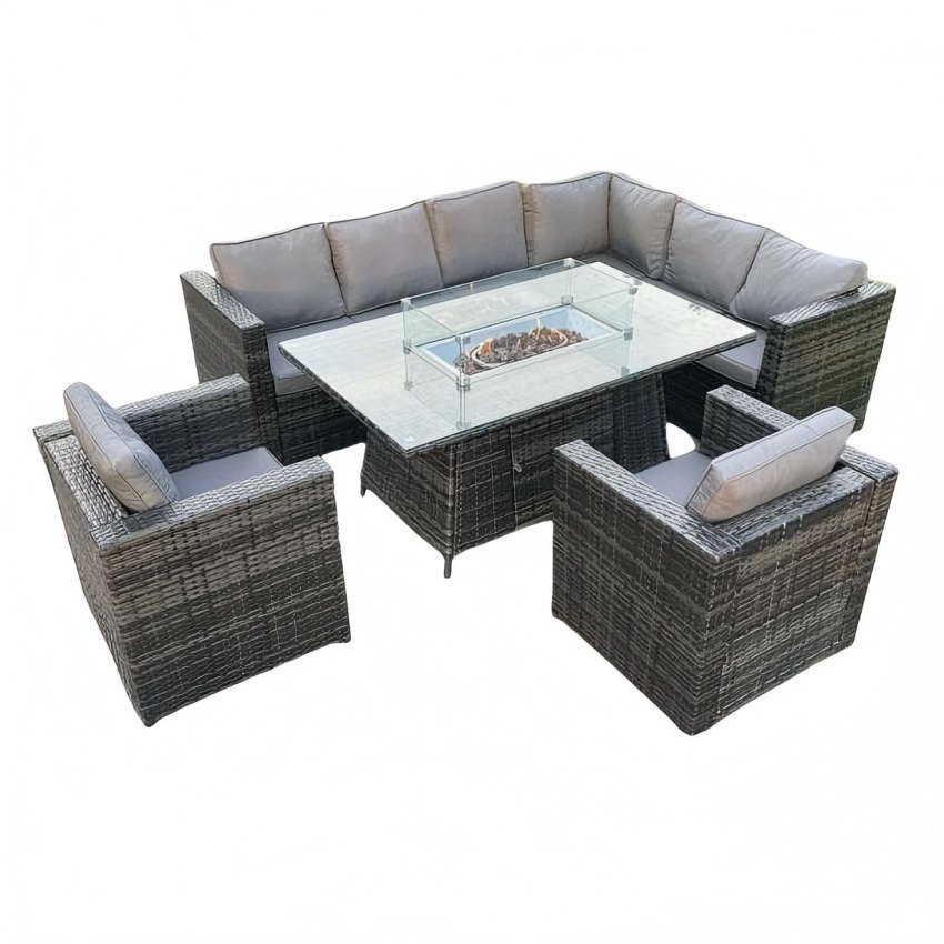 Outdoor wicker(rattan) corner sofa dining set with cushion, comprising 3-seater & single chair, table with or w/o fire pit, offering a multitude of layout possibilities.