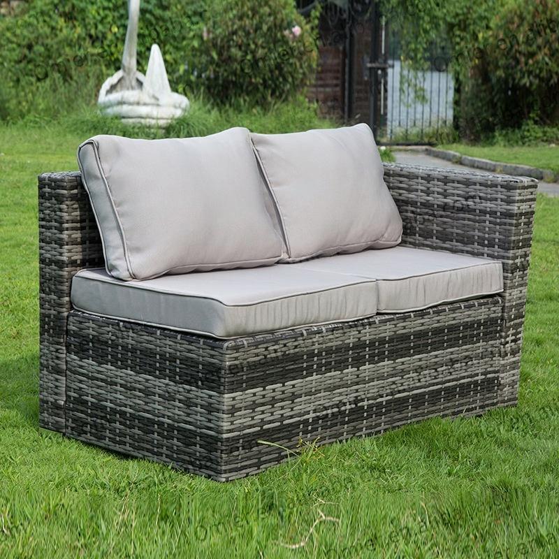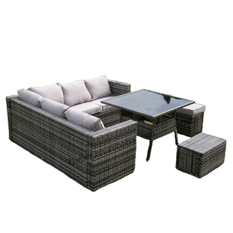 Outdoor wicker(rattan) corner sofa dining set with cushion, comprising 3-seater, loveseat, table and ottoman, offering a multitude of layout possibilities.