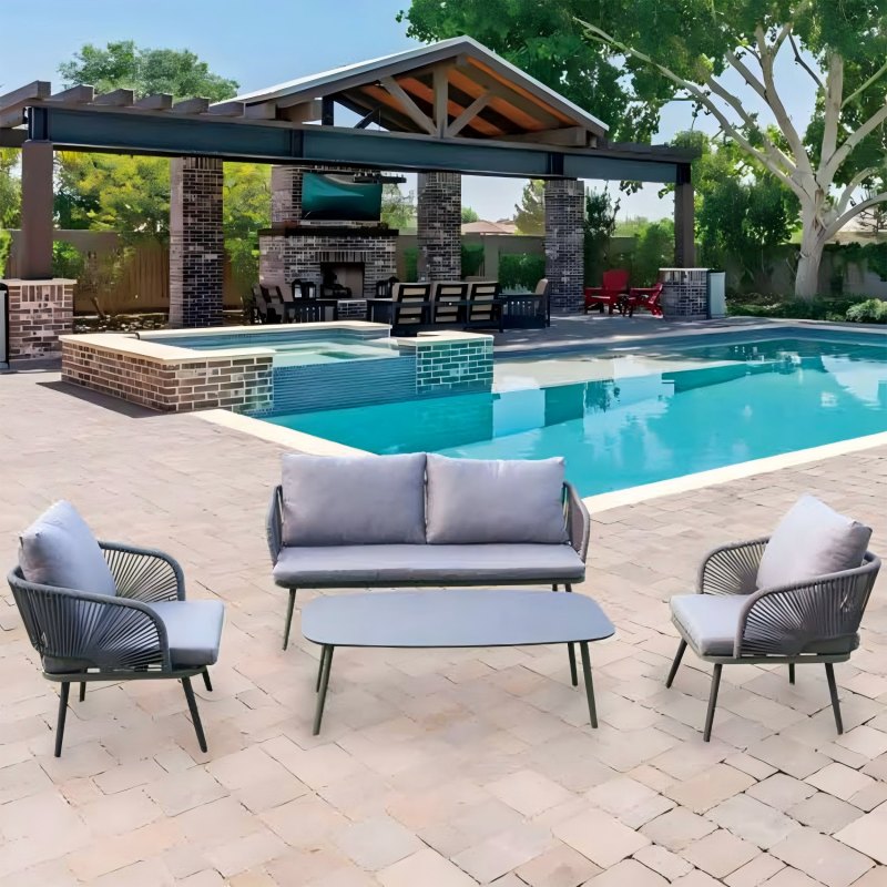 Outdoor rope weaving 4pcs set with cushion, comprising loveseat, coffee table & single chair, offering a multitude of layout possibilities.